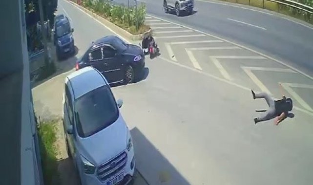 Otomobille çarpışan motosikletin sürücüsü metrelerce savruldu