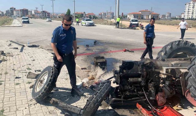 Karaman'da otomobil ile çarpışan traktör paramparça oldu. Kazada 86 yaşındaki traktör sürücüsü hayatını kaybetti.