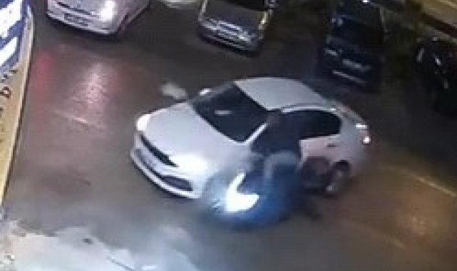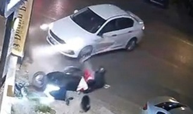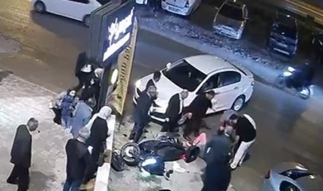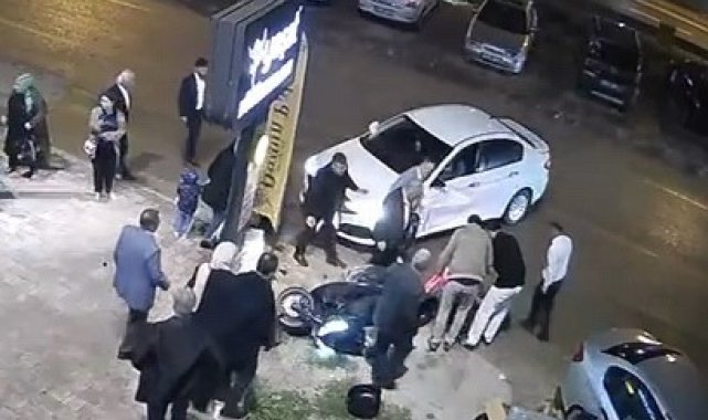 Bursa'nın İnegöl ilçesinde otomobil ile çarpışan motosiklet sürücüsü yaralandı. Kaza anı bir iş yerinin güvenlik kamerasına saniye saniye yansırken, kazayı gören düğün sahipleri yaralıların yardımına koştu.