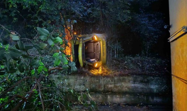 Bursa'da otoparktan çıkarken sürücüsünün kontrolünü kaybettiği otomobil, 10 metrelik yükseklikten sitenin bahçesine uçtu. Kazada sürücü yaralandı
