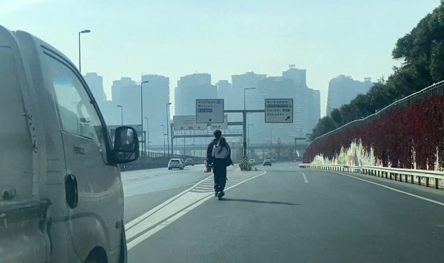 Otoyolda scooter ile tehlikeli yolculuk kamerada