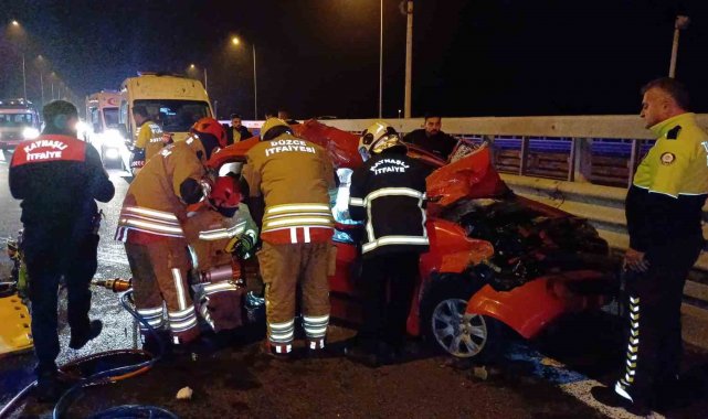 DÜZCE (İHA) – Anadolu Otoyolu Düzce kesiminde meydana gelen trafik kazasında seyir halindeki tıra arkadan çarpan otomobil hurdaya döndü. Kazada otomobilde bulunan 4 kişi yaralanırken sıkışan bir yolcu için itfaiye ekipleri uzun süre kurtarma çalışması yaptı.