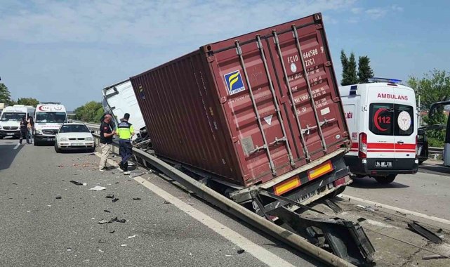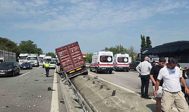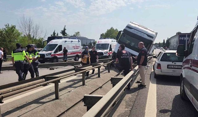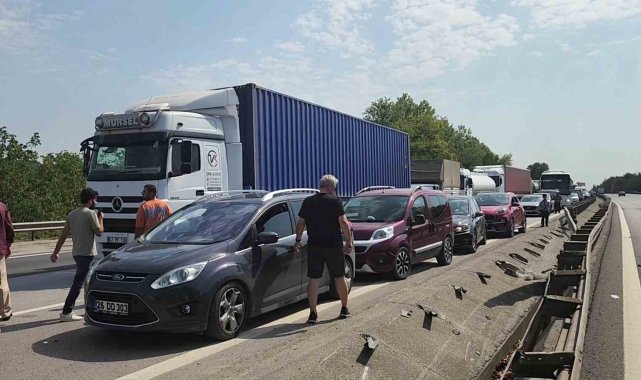 Anadolu Otoyolu Sakarya geçişinde sürücüsünün kontrolünden çıkan tırın çarptığı bariyerler yola savruldu. Aynı istikamette ilerleyen bir kamyonet sürücüsünün de aniden önüne fırlayan bariyerlere çarptığı kazada otoyolun her iki istikametinde de uzun araç kuyrukları oluştu. Kaza, Arifiye ilçesi Fatih Mahallesi mevkiinde meydana geldi. Kocaeli istikametine ilerleyen M.D. (30) kontrolündeki 41 AHY 618 plakalı tır, sürücüsünün direksiyon hakimiyetini kaybetmesi neticesinde bariyerleri adeta biçerek yola savurdu. Arkadan aynı istikametten gelen ve plakası öğrenilemeyen E.Y. (37) idaresindeki kamyonet sürücüsü de savrulan bariyerlerden kaçamayarak kazaya karıştı. Otoyolun her iki istikametinde de uzun araç kuyrukları oluştu. İhbar üzerine bölgeye sağlık ve otoyol jandarması ekipleri sevk edildi. Bölgede bir süre aksayan trafik, kazaya karışan araçların kaldırılması ve yola saçılan bariyer parçalarının temizlenmesinin ardından normal seyrine döndü. Maddi hasarın meydana geldiği kaza ile ilgili inceleme başlatıldı.