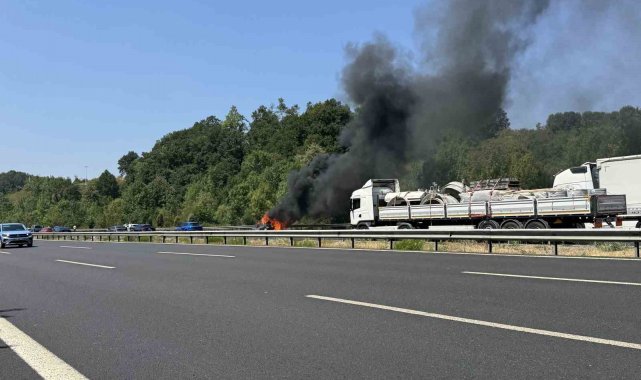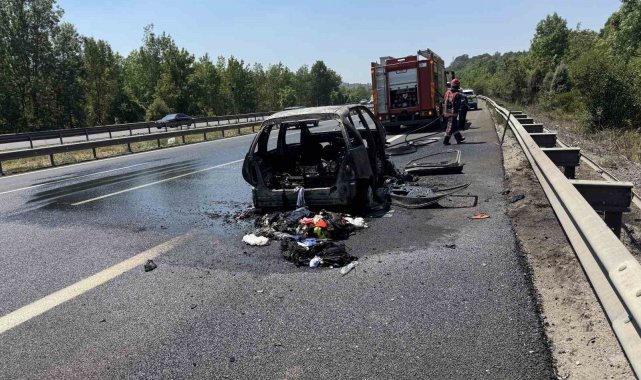 Anadolu Otoyolu Sakarya geçişinde seyir halindeyken alev alev yanan yabancı plakalı otomobilden geriye, demir yığınları kaldı.