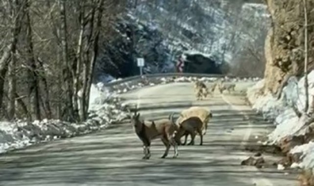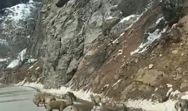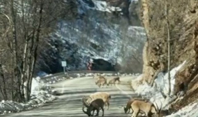 Tunceli'de Ovacık yolunda ilerleyen bir grup genç, yolun ortasında sürü halinde duran dağ keçileriyle karşılaştı. Gençler bir süre bekleyerek o anları cep telefonu kamerasıyla kaydetti.
