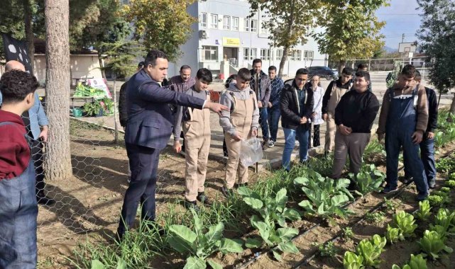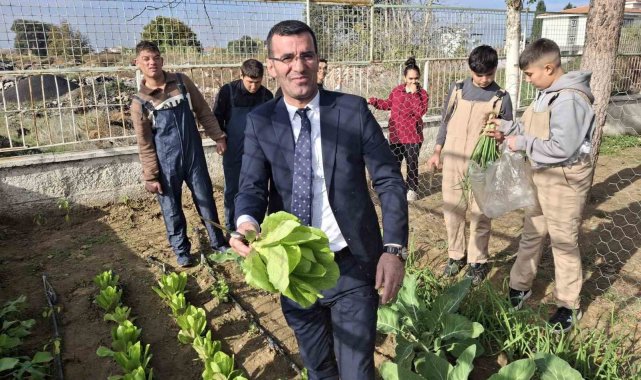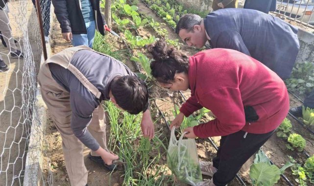 Ziyarette Özel Eğitim Sınıfı Tarım Alanı öğrencilerinin uygulama bahçesinde yetiştirdikleri ürünlerin hasadı protokol üyeleri ve öğrenciler tarafından birlikte gerçekleştirildi.