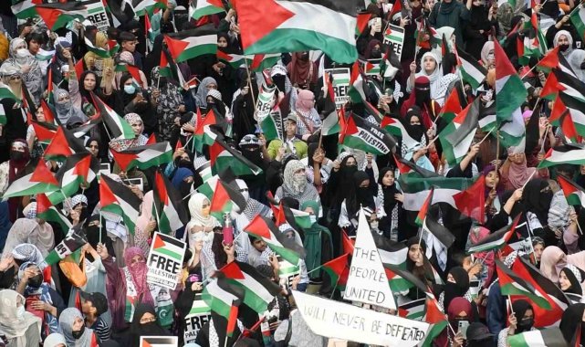 Pakistan'da binlerce kişi, ellerinde Filistin bayrakları ile Gazze Şeridi için destek gösterisi düzenledi.