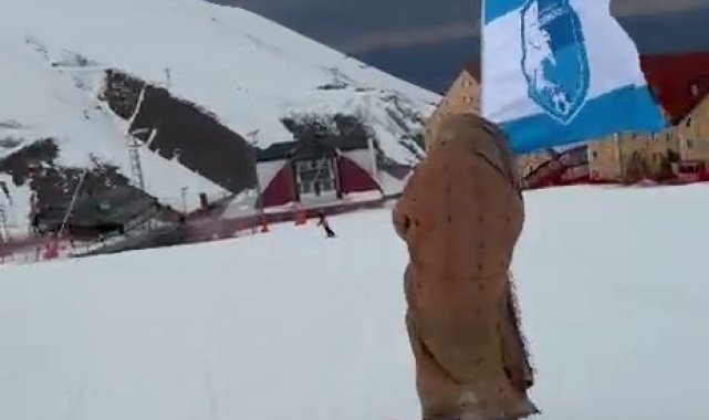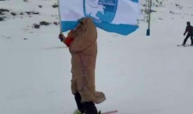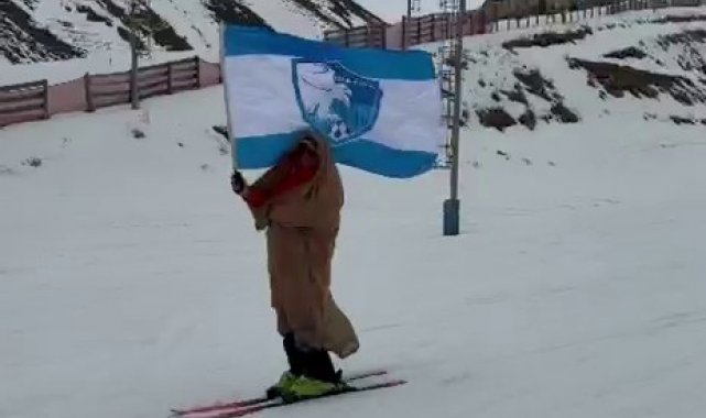 Bu yıl nisan ayının 15'ine kadar sezonu uzatan Palandöken'de kar ve renkli görüntüler eksik olmuyor. Zirveden ehram ve Erzurumspor bayrağı ile kayan kayakçı görenleri gülümsetti.