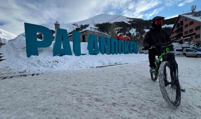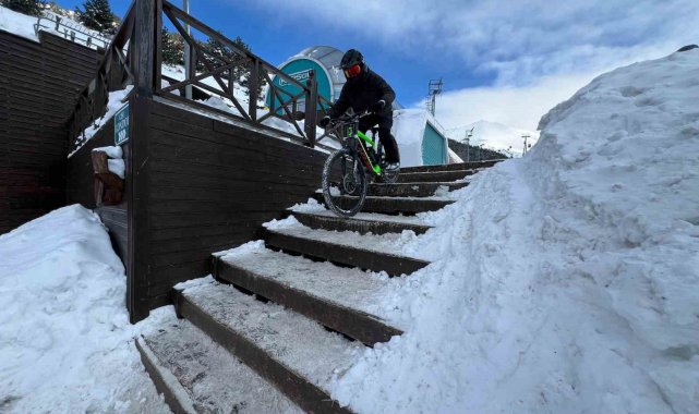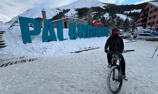 Palandöken Kayak Merkezinde düzenlenen bisiklet yarışmalarına katılan Türkiye'nin 4 bir yanından Erzurum'a gelen profesyonel sporcular yarışma sonrası Palandöken'in zirvesinden bisikletleriyle aşağıya indi. Bu anları aksiyon kameraları tarafından kaydeden sporcuların karlı zemindeki yolculuğu adeta nefes kesti.