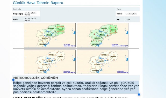 Meteorolojiden yapılan açıklamada bölge genelinde havanın parçalı ve çok bulutlu olacağını, aralıklı sağanak ve gök gürültülü sağanak yağışların etkili olacağı bildirildi. Bingöl çevrelerinde yağışların yer yer kuvvetli olmasının beklendiği, ayrıca sabah saatlerinde bölgede yer yer pus olacağı uyarısı yapıldı.