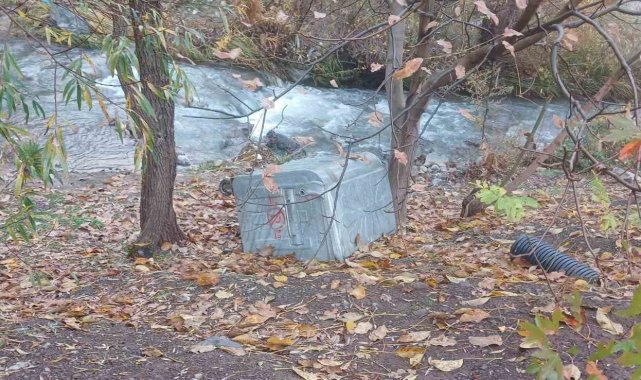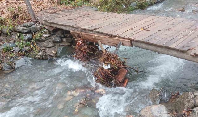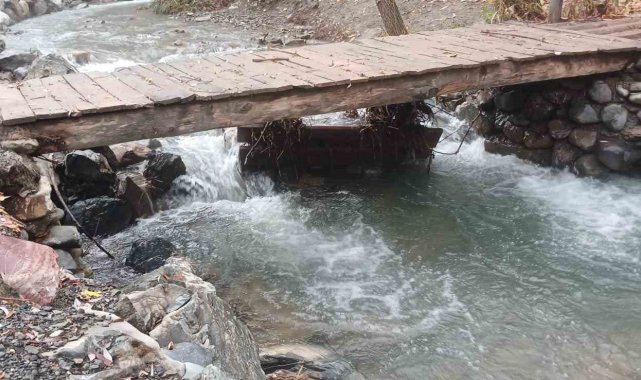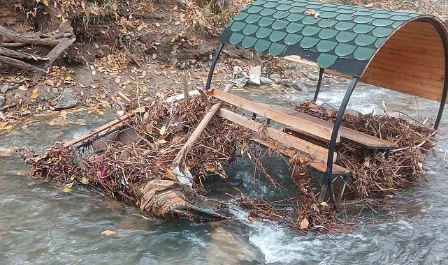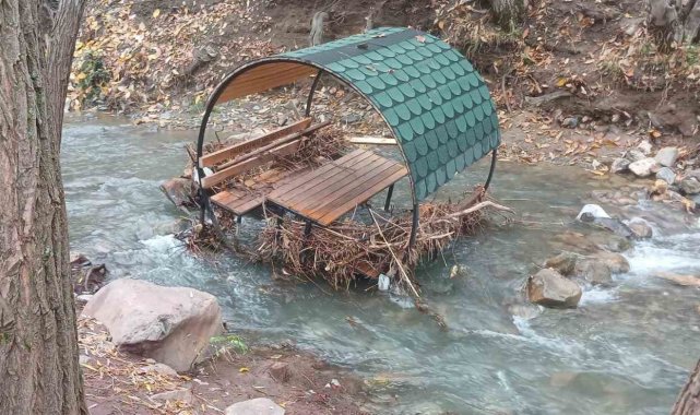 Elazığ'ın Palu ilçesinde yağışlarla birlikte Teke Deresi taştı. Taşmayla birlikte banklar ve çöp konteynerleri sürüklendi.