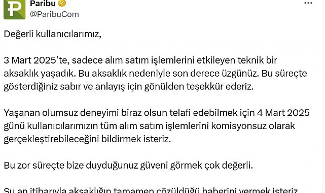 Paribu, sosyal medya hesabından yaptığı açıklamada, 3 Mart tarihinde yaşanan alım satım işlemlerindeki 10 saatlik aksaklıktan dolayı bugün yapılanacak alım satım işlemlerinden komisyon almayacağını bildirdi.