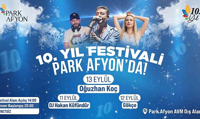 Afyonkarahisar'ın en büyük yaşam ve alışveriş merkezi olan Park Afyon, 10.'ncu yılını müzikten eğlenceye, gastronomiden çocuk etkinliklerine kadar birçok farklı deneyimle kutlamaya hazırlanıyor. Festival kapsamında 11 Eylül'de ünlü DJ Hakan Küfündür, 12 Eylül'de güçlü sahne performansı ile Gökçe ve 13 Eylül'de sevilen sanatçı Oğuzhan Koç müzikseverlerle buluşacak. Tüm konserler ücretsiz olarak gerçekleşecek ve Afyonkarahisar halkına keyifli anlar yaşatacak. Festival süresince ziyaretçiler, farklı lezzetlerin sunulacağı yeme-içme stantlarını deneyimleyebilecek. Çocuklar için özel olarak hazırlanan oyun alanları ve yüz boyama etkinlikleri küçük ziyaretçilere eğlenceli anlar yaşatacak. Ayrıca gün boyunca düzenlenecek mini konserler ve sürpriz aktiviteler festivale renk katacak. Park Afyon Alışveriş Merkezi Müdürü Emrah Aras, yaptığı açıklamada, "10 yıldır Afyonkarahisar'a sadece alışveriş değil, sosyal yaşam ve eğlence alanında da değer katıyoruz. Bu özel yıldönümünü ziyaretçilerimizle birlikte coşkuyla kutlamak bizim için byk mutluluk. Tüm halkımızı 9 - 14 Eylül tarihleri arasında gerçekleşecek 10. Yıl Festivalimize davet ediyoruz" ifadelerini kullandı.