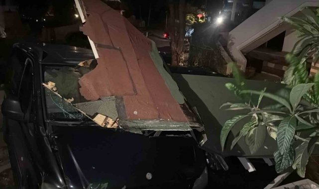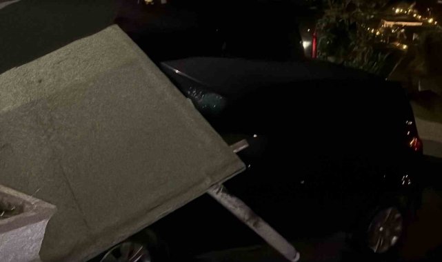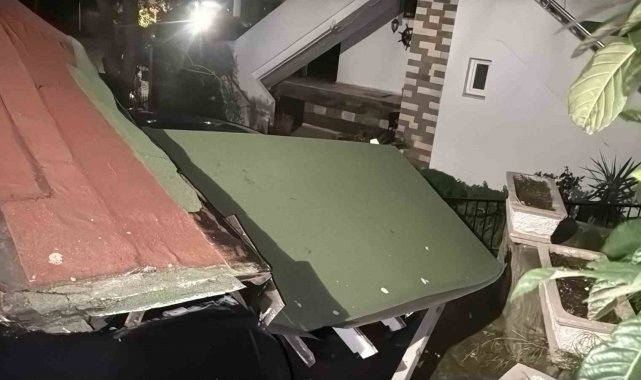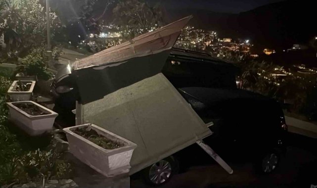 Muğla'nın Bodrum ilçesinde etkili olan fırtınada yerinden kopan sundurma, park halindeki araçların üzerine yıkıldı.