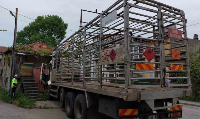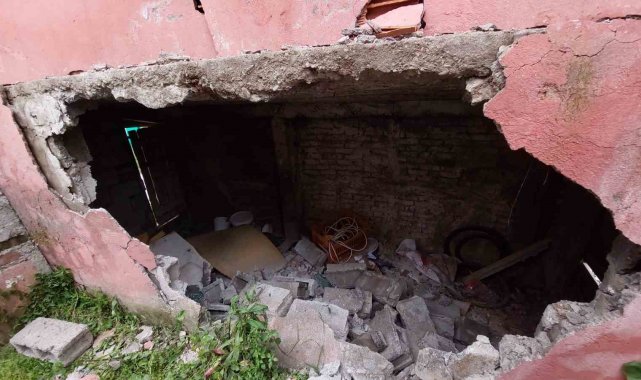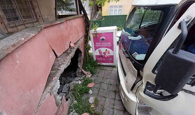 Samsun'da park halindeki bir kamyonun aniden hareket etmesi sonucu çarptığı metruk binanın duvarı yıkıldı.
