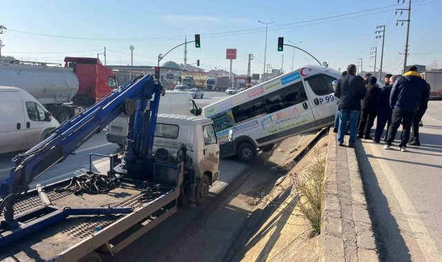 Yaralananın olmadığı kaza nedeniyle bölgeye polis ekipleri sevk edildi. Asılı kalan minibüs, çekici yardımıyla bulunduğu yerden kaldırıldı.