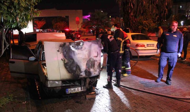 Aydın'ın Efeler ilçesinde park halideyken yanan otomobil itfaiye ekiplerinin müdahalesiyle söndürülürken, otomobil küle döndü.