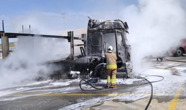 Hatay'ın Reyhanlı ilçesinde Cilvegözü Sınır Kapısı'nda park halindeki tır, yanarak alev topuna döndü. Alevlere teslim olan tır, kullanılmaz hale geldi.