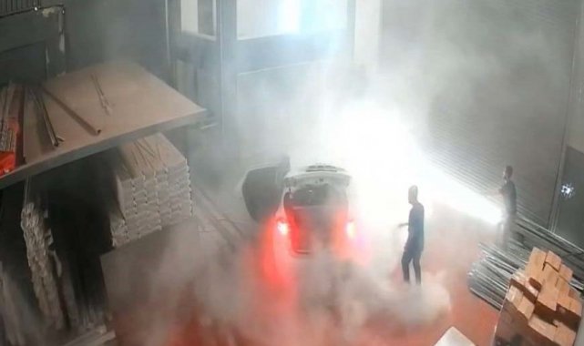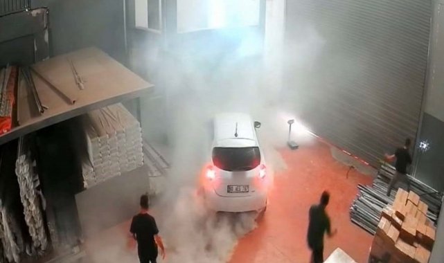 Osmaniye'de işyeri içerisinde park halinde bulunan elektrikli otomobilden henüz belirlenemeyen bir nedenle dumanlar yükseldi. İtfaiye ekiplerinin 2 saat süren mücadelesine rağmen sönmeyen yangın, iş yerinin güvenlik kamerasına yansıdı.