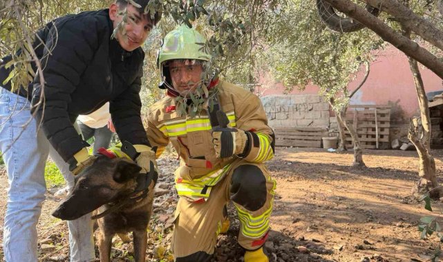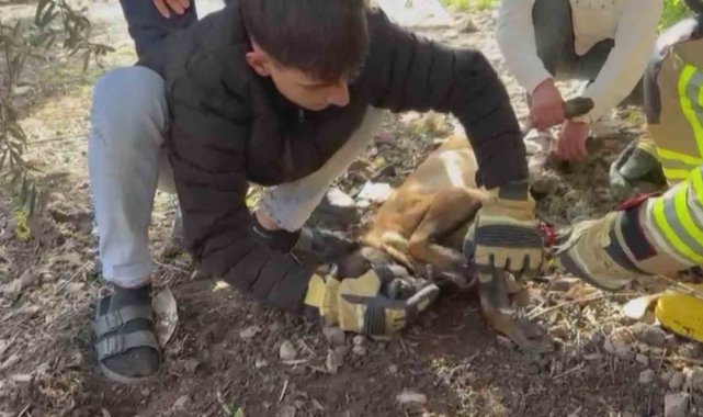 Hatay'da patisi zincire sıkışan köpeğin yardımına itfaiye yetişti.