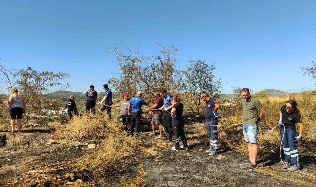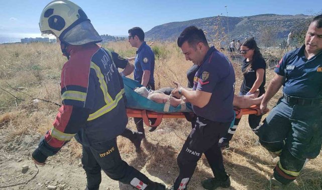 Aydın'ın Kuşadası ilçesinde emekli bir öğretmen, pazardan aldığı patlıcanları arazide közlemek isterken çıkan yangına panikle tepki verince, 25 metrelik uçurumdan yuvarlandı. Emekli öğretmeni itfaiye ekipleri kurtardı.
