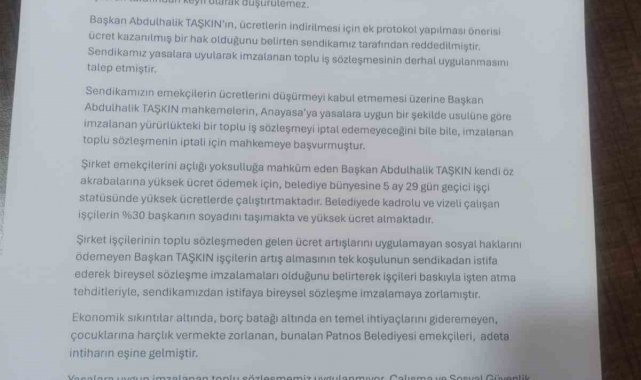 Ayrıca, belediyeye yeni geçici işçilerin yüksek maaşlarla alındığı iddia edilirken, mevcut çalışanların toplu sözleşmeden doğan haklarını alamadığı dile getirildi. Belediye İş Sendika'sı yetkilileri, işçilerin baskı altında olduğunu ve bireysel sözleşmeler imzalamaya zorlandığını öne sürdü.
