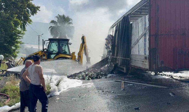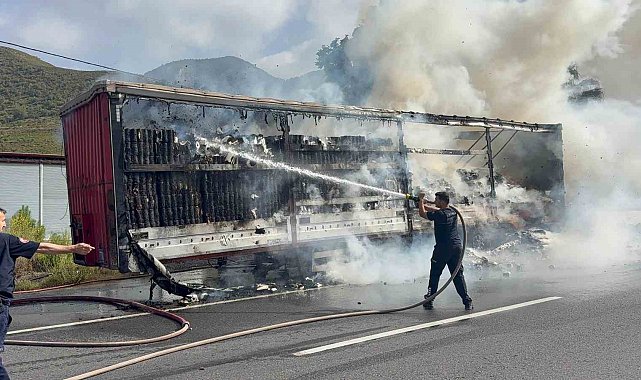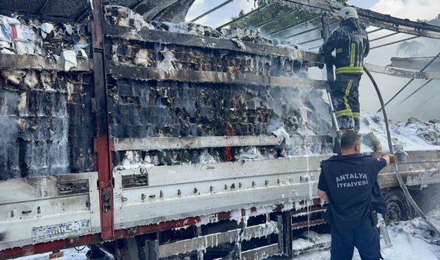 Antalya'nın Gazipaşa ilçesinde seyir halindeyken dumanlar çıkan peçete yüklü tırın dorsesi alevlere teslim oldu. Sürücünün soğukkanlı müdahalesi faciayı önledi.