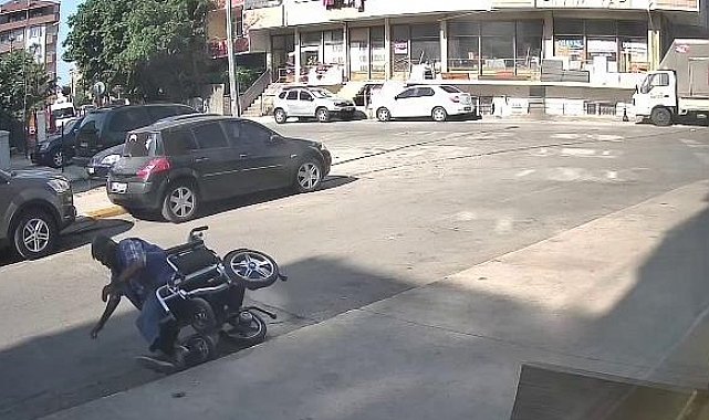 Pendik'te akülü aracının freninin boşalması sonucu yere düşen engelli Fatih Bayrak'ın yardımına çevredeki esnaf koştu. O anlar bir işyerinin güvenlik kamerasına yansıdı.
