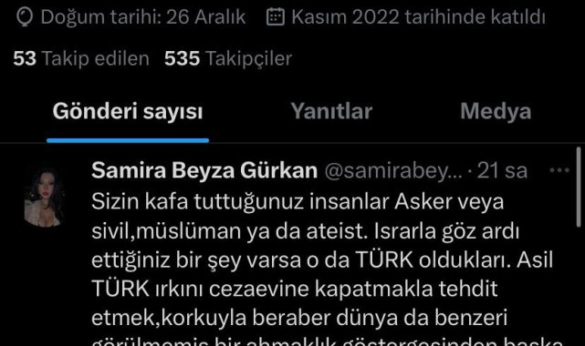 Sivas'ta yaklaşık 6 ay önce sosyal medya hesapları üzerinden Peygamber Efendimize, dini değerlere ve devlet büyüklerine hakaret eden, 29 ayrı suç kaydı bulunan Beyza Gürkan (22), çıkartıldığı mahkemece paylaşımları kendisinin yapmadığını iddia etse de 10 ay hapis cezasına çarptırılmıştı. Ev hapsi süren Gürkan bu kez de Ümit Özdağ'a destek veren paylaşımlarıyla dikkat çekti.