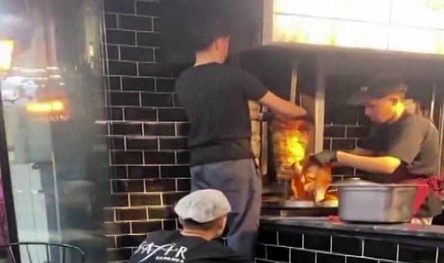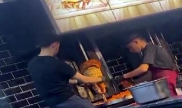 Pişmiş dönerin üzerine çiğ tavuk eklerken cep telefonu kamerası ile kaydedildi