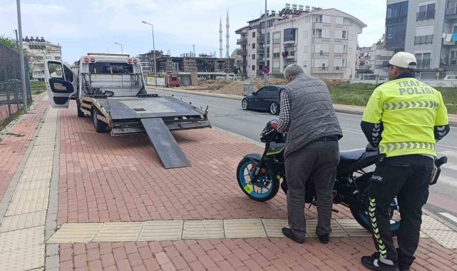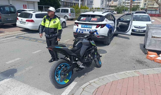 Manavgat'ta devriye görevindeki ilçe Emniyet Müdürlüğü Trafik Denetleme Büro Amirliği ekipleri, Örnek Mahallesi istikametine seyir halindeki plakası bulunmayan ve abartılı egzoz nedeniyle gürültü kirliliği oluşturan motosikleti durdurdu. Yapılan kontrolde plakası bulunmayan motosikleti kullanan Mert K.Ü.'nün ehliyetinin yetersiz olduğu, kask takmadığı ve motosikletin aynasının takılı olmadığı belirlendi.