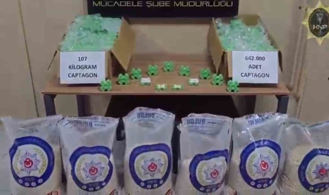 HATAY (İHA) – Hatay'da polis ekipleri tarafından gerçekleştirilen operasyonda plastik pervaneler içine zulalanmış 107 kilogram ağılığında olan 642 bin adet Captagon hap ele geçirildi.