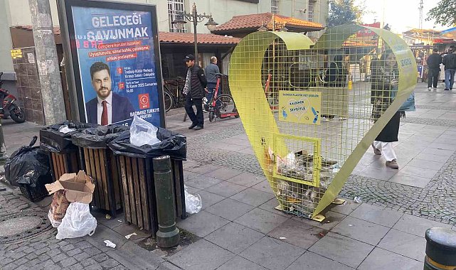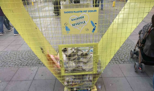 Eskişehir'de bazı duyarsız vatandaşlar, hemen yanında 3 adet çöp kutusu bulunan kalp şeklindeki geri dönüşüm kafesinin içerisine atık maddeler bıraktı.