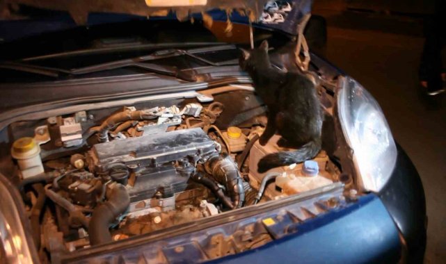 Aksaray'da asayiş uygulaması yapan polisin şüphe üzerine durdurduğu hafif ticari aracın motor kısmından kedi çıktı. Polisin şüphesi kediyi kurtarırken, miyavlama sesleriyle durumu fark eden polis ve araç sahibi kediyi sağ salim çıkarttı.