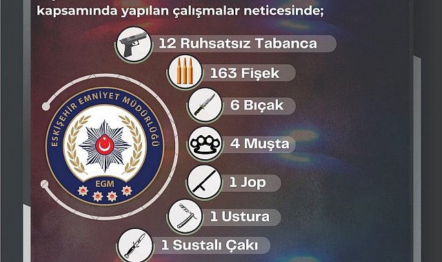 Edinilen bilgilere göre, 30 Ocak - 5 Şubat 2025 tarihleri arasında Eskişehir Emniyet Müdürlüğü ekiplerince halkın huzur ve güvenliğini sağlamak amacıyla çalışma yapıldı. 'Ateşli Silah ve Bıçaklar Hakkındaki Kanun' ile 'Kabahatler Kanunu' çerçevesinde yapılan çalışmalarda; 12 ruhsatsız tabanca, 163 fişek, 6 bıçak, 4 muşta, 1 jop, 1 ustura ve 1 sustalı çakı ele geçirildi. Ekiplerin 20 olaya müdahale ettiği çalışmaların sonunda 21 şüpheliye işlem uygulandığı öğrenildi.