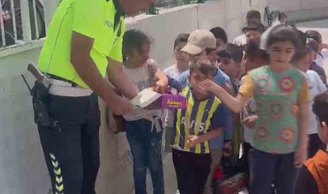 Hatay'da polis ekiplerinin okul önünde sıra olan öğrencilere çikolata dağıttığı görüntüler yürekleri ısıttı.