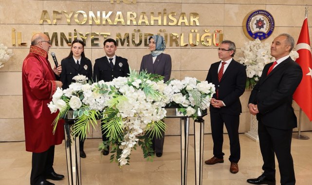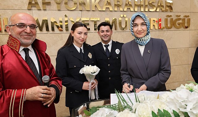 Afyonkarahisar İl Emniyet Müdürlüğü'nde görevli polis memurları Furkan Arslan ve Kübra Nur Karadoğan, unutulmaz bir nikah töreniyle dünyaevine girdi. Emniyet Müdürlüğü binasında düzenlenen törene, mesai arkadaşlarının yanı sıra il protokolü de katıldı.