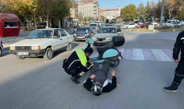 Karaman'da otomobil ile çarpışan motosikletin sürücüsü yaralandı. Kaza yerinde önlem alan trafik polisi ise yerde yatan yaralının başında sağlık ekibi gelinceye kadar bekledi.