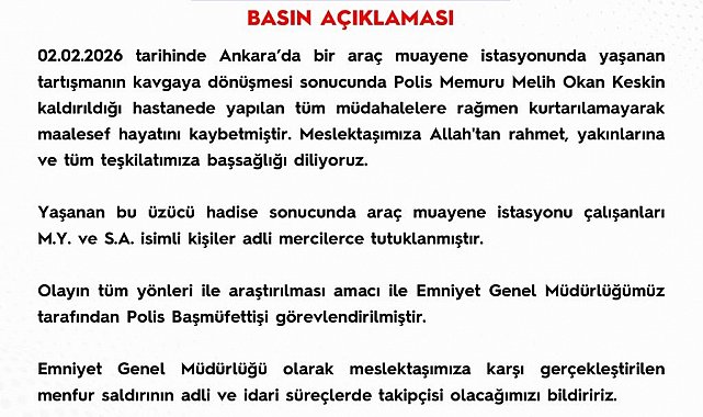 Emniyet Genel Müdürlüğü tarafından yapılan açıklamada, "Meslektaşımıza Allah'tan rahmet, yakınlarına ve tüm teşkilatımıza başsağlığı diliyoruz. Yaşanan bu üzücü hadise sonucunda araç muayene istasyonu çalışanları M.Y. ve S.A. isimli kişiler adli mercilerce tutuklanmıştır. Olayın tüm yönleri ile araştırılması amacı ile Emniyet Genel Müdürlüğümüz tarafından polis başmüfettişi görevlendirilmiştir. Emniyet Genel Müdürlüğü olarak meslektaşımıza karşı gerçekleştirilen menfur saldırının adli ve idari süreçlerde takipçisi olacağımızı bildiririz" denildi.