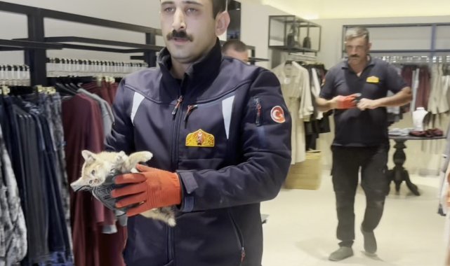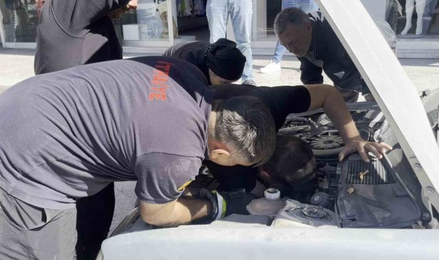 Aksaray'da korktuğu için girdiği aracın kaputunda sıkışan yavru kedi itfaiye ve polis ekiplerinin çalışmasıyla sıkıştığı yerden kurtarılırken, diğer araçların altına kaçan kedi bir iş yerine girince yakalandı.