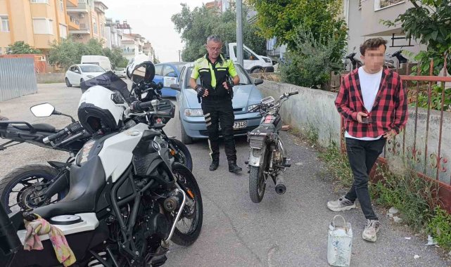 Manavgat'ta polisi görünce kaçmaya başlayan motosiklet sürücüsü kısa sürede yakalandı. Yapılan incelemede plakasız motosikletin şase ve motor numaralarının silindiği, sürücünün ise ehliyetinin bulunmadığı tespit edildi.