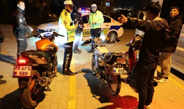 Mahalle aralarında "abart egzoz" diye tabir edilen aşırı yüksek ses çıkaran egzozla gürültü kirliliğine neden olan, egzoz patlatarak vatandaşları rahatsız eden ve ehliyetsiz motosiklet kullanarak trafik güvenliğini tehlikeye atan sürücülerin peşine düşen bekçi ve polis ekipleri, gece yarısı Cumhuriyet Mahallesi TOKİ konutlarında bölgesinde 3 motosiklet sürücüsü gence baskın yaptı. Yapılan baskında motosikletleri inceleyen polis ekipleri 2 motosiklette abartı egzoz olduğunu tespit ederken, sürücülerin ise ehliyetsiz olduğu belirledi. 68 AFG 689, 68 AFE 699 ve 68 AEF 784 plakalı motosiklet sürücüleri M.C., F.E.F. ile M.S.'ye abartı egzoz ve ehliyetsiz motosiklet kullanmaktan yaklaşık 65 bin lira ceza kesilirken, motosikletler ehliyetli yakınlarına teslim edildi.