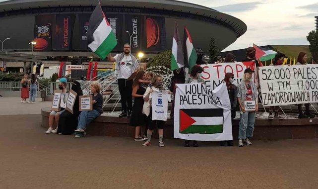 Karşılaşma öncesi maçın oynanacağı Spodek Spor Salonu'nun önünde de Polonyalı sağcı ve solcu gruplar tarafından iki ayrı protesto gösterisi düzenlendi. İsrail'i Gazze'de soykırıma son vermeye çağıran protestocular, uluslararası topluma da İsrail'i her şekilde izole etmeye çağrısı yaptı. "Gerçek terörist İsrail devletidir", "Filistin'e özgürlük", "Bir zamanlar Almanlar, şimdi ise Yahudiler. Bütün dünya işledikleri suçları görüyor" dövizleri taşınan iki protesto gösterisinde de sık sık İsrail karşıtı sloganlar atıldı.