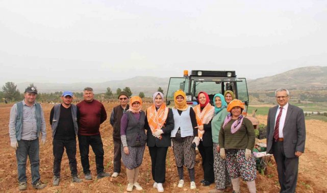 Poşusunu takan Kaymakam Kuran üreticilerle birlikte kekik dikti