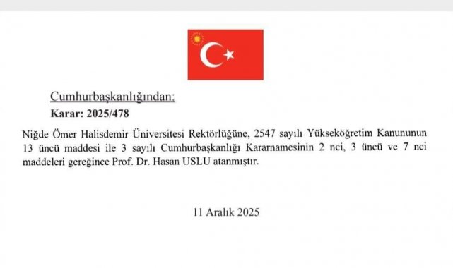 2025/478 No'lu Cumhurbaşkanlığı Kararı kapsamında Niğde Ömer Halisdemir Üniversitesi Rektörlüğüne Prof. Dr. Hasan Uslu yeniden atandı. Böylece Prof. Dr. Uslu, görevini yeni dönemde de sürdürme yetkisi aldı.