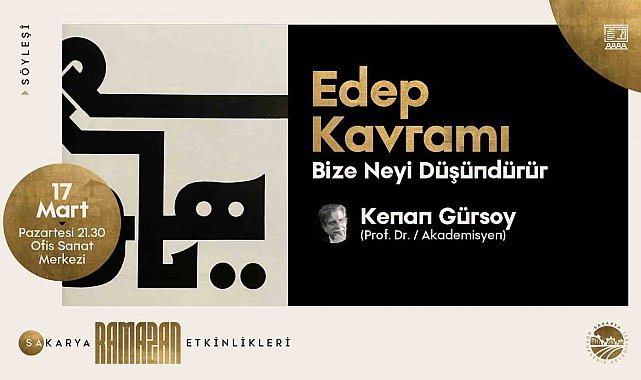 Sakarya Büyükşehir Belediyesi kültür sanat etkinlikleri Ramazan ayına özel programlarla devam ediyor. Prof. Dr. Kenan Gürsoy'un konuşmacı olarak katılacağı "Edep Kavramı Bize Neyi Düşündürür" konulu söyleşi, 17 Mart Pazartesi OSM'de dinleyiciyle buluşacak.