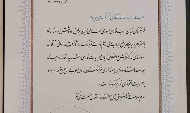 "Sayın Prof. Dr. Nimet Yıldırım, İran İslam Cumhuriyeti Fars Dili ve Edebiyatı Akademisi tüzüğünün 6. maddesi uyarınca, Fars Dili ve Edebiyatı Şurası'nın 1403/9/5 tarihli 483. toplantısında oybirliği ile, "bilim, edebiyat ve kültür" alanlarındaki seçkin ve yüksek konumunuzdan, Fars dili ve edebiyatının gelişmesi ve yücelmesindeki çabalarınız ve katkılarınızdan dolayı kadirşinaslık göstergesi olarak sizi "Bilim Kurulu" üyesi olarak seçmiştir. Sağlığınızın ve başarınızın devamını Yüce Allah'tan niyaz ediyorum. Fars Dili ve Edebiyatı Akademisi Başkanı Ğolamali Haddad Adil"