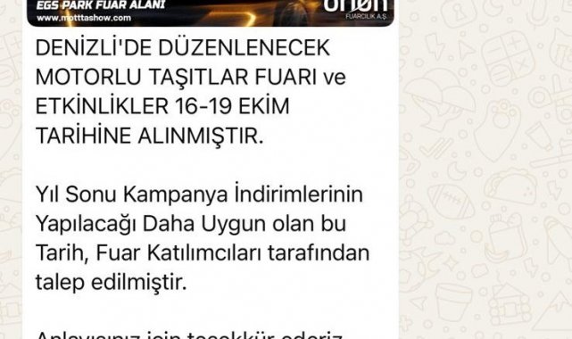 Söz konusu paylaşımı büyük bir üzüntüyle öğrendiklerini belirten Bizim Medya ve Fuarcılık Yönetim Kurulu Başkanı Birol Karataş, "2-6 Temmuz 2025 tarihleri arasında gerçekleştireceğimiz Denizli Motorlu Taşıtlar Fuarı öncesinde, kamuoyunu yanıltmaya yönelik bazı paylaşımlar tarafımızca üzüntüyle takip edilmiştir. Orion Fuarcılık tarafından organize edilen MOTTA Fuarı, daha önce sosyal medya hesaplarımızda ve TOBB alan tahsis takviminde ilan edildiği üzere 16-19 Ekim 2025 tarihlerinde düzenlenecektir. Bu tarih, resmi olarak duyurulmuş ve ilgili tüm mercilerle paylaşılmıştır. Ancak bugün, sosyal medya ve WhatsApp üzerinden dolaşıma sokulan ve içeriğinde 'MOTTA' ifadesine yer verilmeden yapılan bir paylaşımda, şu an düzenlenmekte olan DEMOT Denizli Motorlu Taşıtlar Fuarı'nın ertelendiği izlenimi oluşturulmaya çalışılmıştır. Söz konusu paylaşım, hem kamuoyunu yanıltıcı nitelikte olup hem de mevcut fuar organizasyonumuza gölge düşürmeyi amaçlamaktadır. Bu tür yanıltıcı ve kasıtlı içeriklerle kamuoyunda yanlış algı oluşturulmasına yönelik girişimleri şiddetle kınıyor, tüm yasal haklarımızı saklı tuttuğumuzu ve gerekli hukuki süreçleri başlatacağımızı kamuoyuna saygıyla bildiriyoruz" şeklinde konuştu.