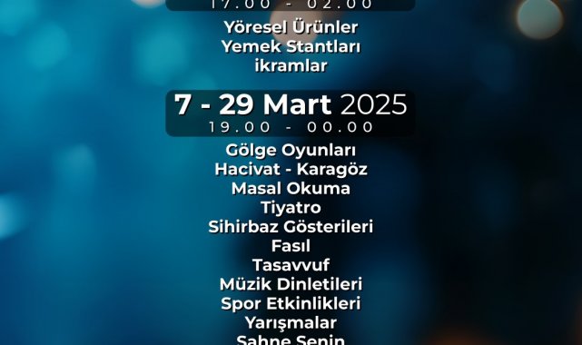 Yılmaz, 3 Mart'ta yöresel ürünler, yemek stantları ve çeşitli ikramlarla kapılarını açacak Ramazan Sokağı'nda etkinliklerin 7 Mart'ta başlayacağını ifade ederek, "Gölge oyunlar, Hacivat-Karagöz, masal okuma, tiyatro, sihirbaz gösterileri, fasıl, tasavvuf, müzik dinletileri, spor etkinlikleri ve çeşitli yarışmalarla Ramazan'ın güzelliklerini doyasıya yaşayacağız. Tüm hemşerilerimizi Ramazan Sokağı'na bekliyorum" diye konuştu.