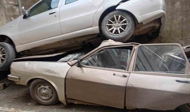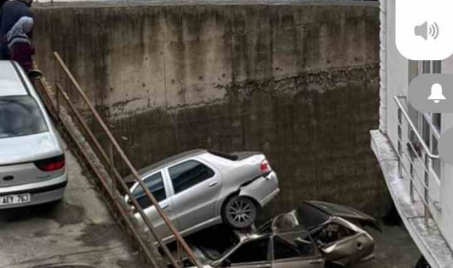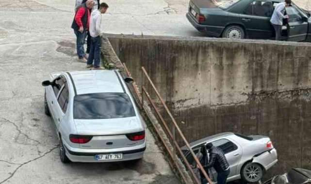 Rampada geriye kayan otomobil 8 metreden düşerek park halindeki aracın üzerine çıktı